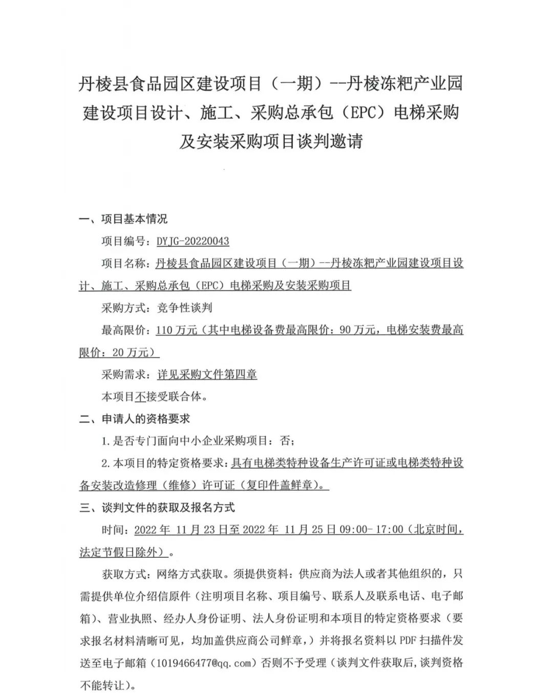 丹棱县食品园区建设项目 (一期)--丹棱冻粑产业园建设项目设计、施工、采购总承包 (EPC) 电梯采购及安装采购项目谈判邀请公告