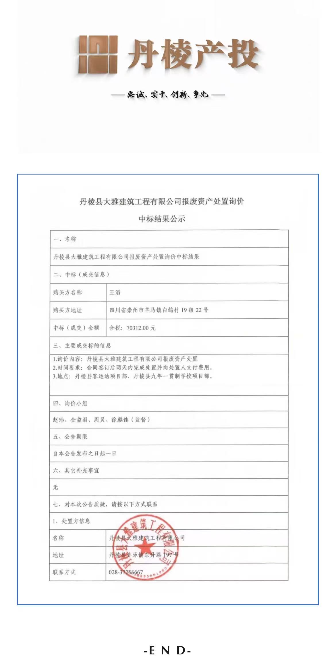 丹棱县大雅建筑工程有限公司报废资产处置询价中标结果公示