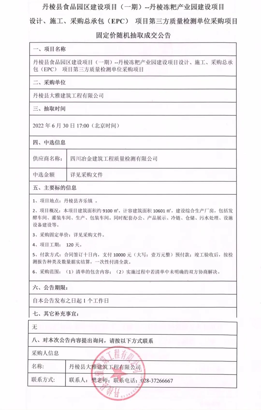 丹棱冻粑产业园建设项目设计、施工、采购总承包(EPC)项目第三方质量检测单位采购项目固定价随机抽取成交公告