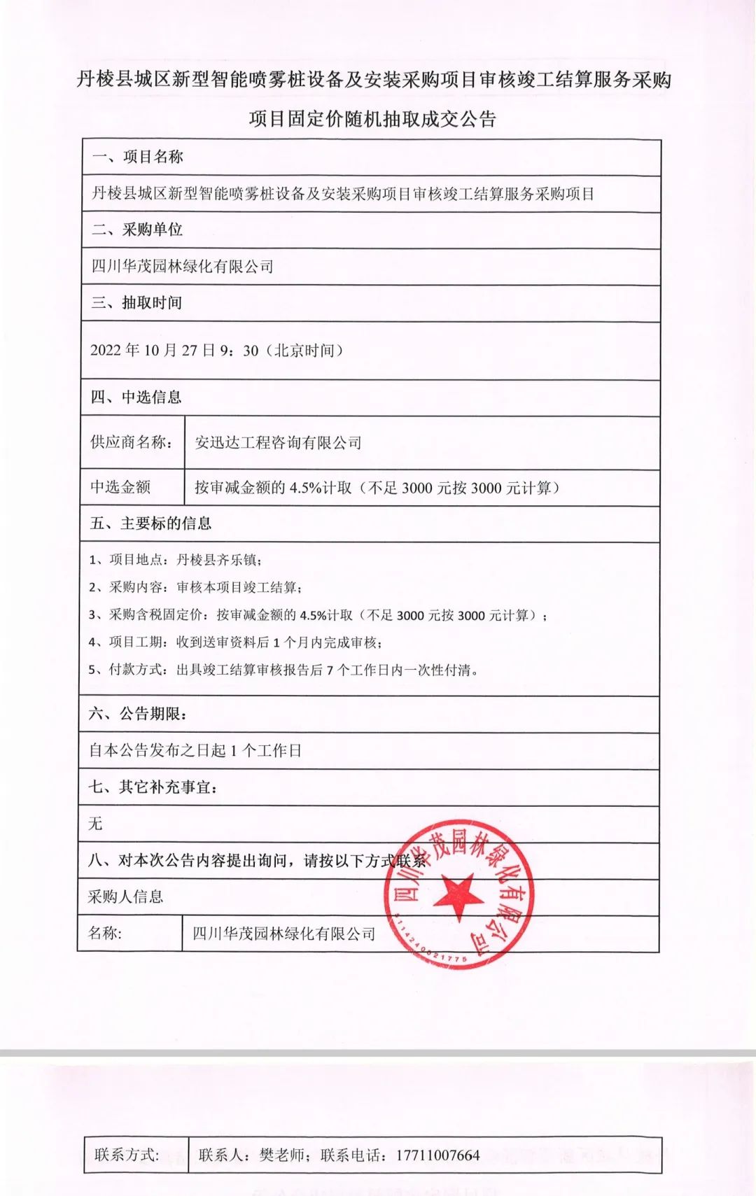 丹棱县城区新型智能喷雾桩设备及安装采购项目审核竣工结算服务采购项目固定价随机抽取成交公告