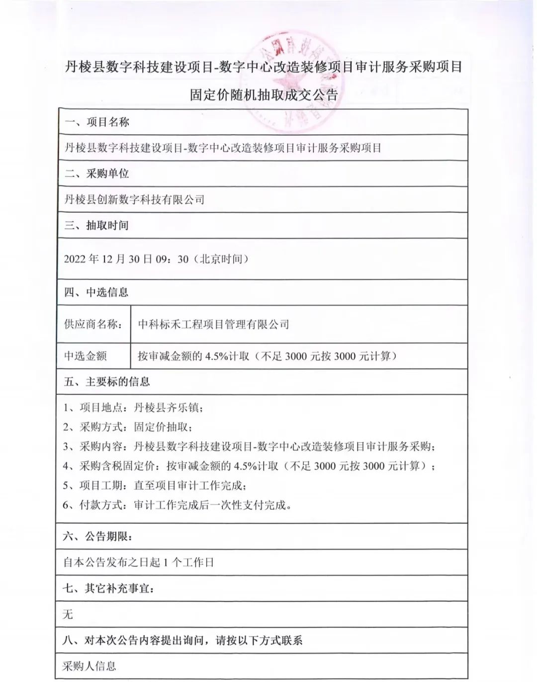 丹棱县数字科技建设项目-数字中心改造装修项目审计服务采购项目固定价随机抽取成交公告