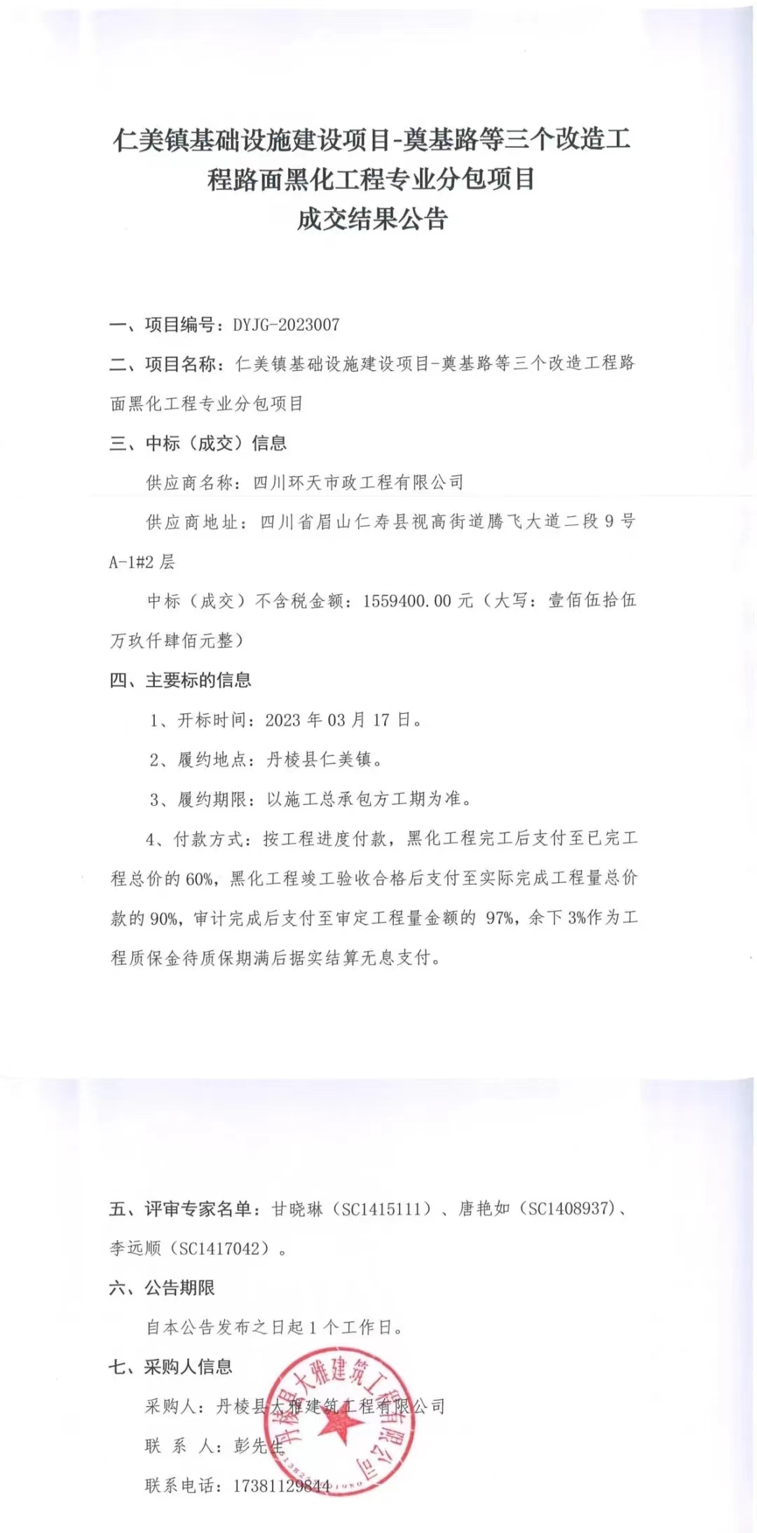 仁美镇基础设施建设项目-奠基路等三个改造工程路面黑化工程专业分包项目成交结果公告
