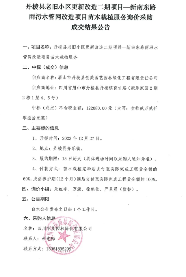 丹棱县老旧小区更新改造二期项目——新南东路雨污水管网改造项目苗木栽植服务询价采购成交结果公告