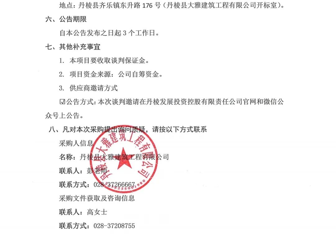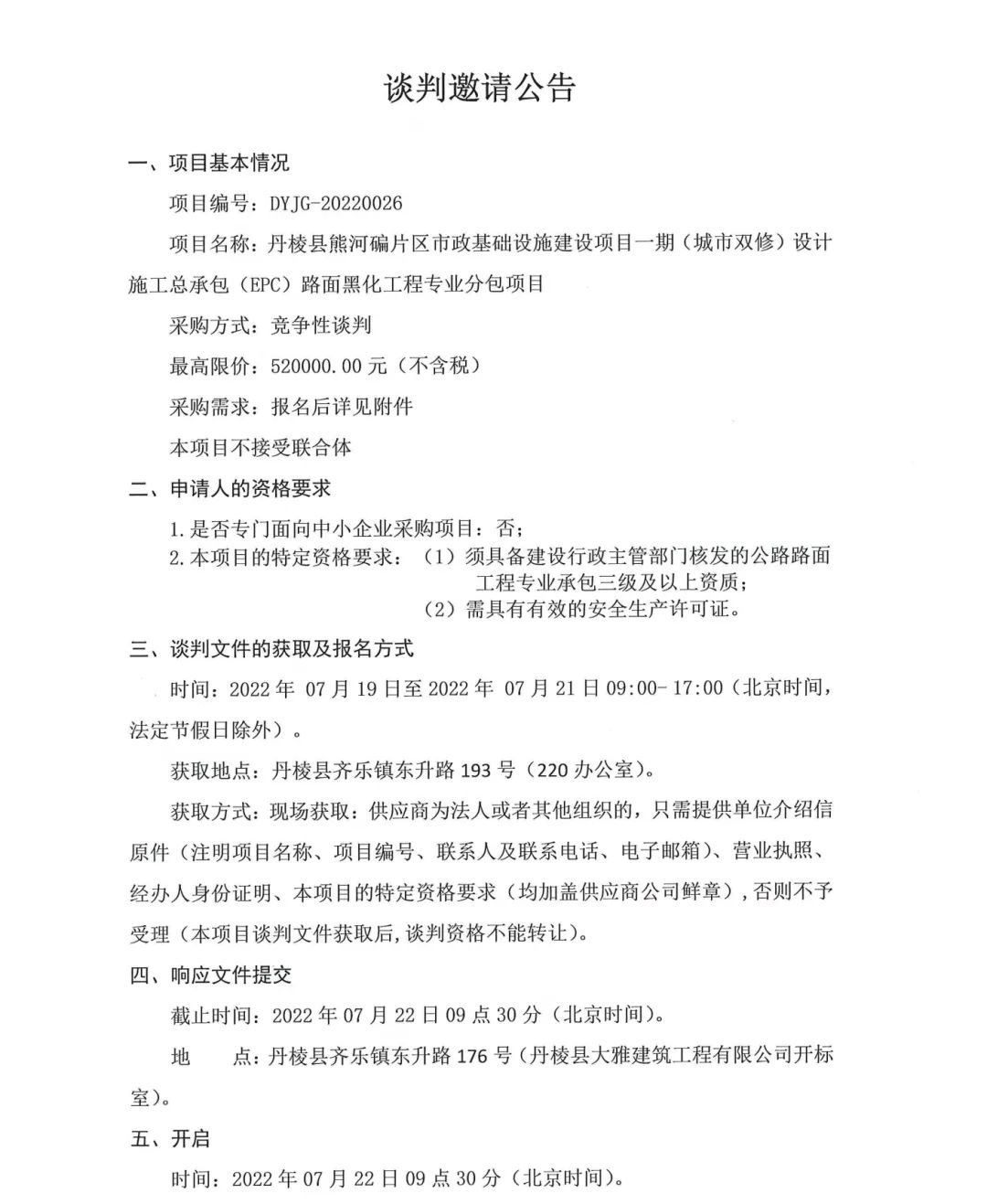 丹棱县熊河碥片区市政基础设施建设项目一期(城市双修)设计施工总承包(EPC)路面黑化工程专业分包项目谈判邀请公告