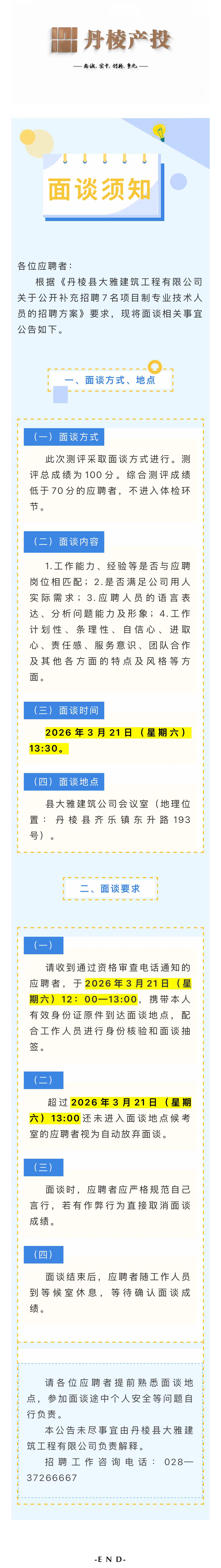 丹棱县大雅建筑工程有限公司关于公开补充招聘7名项目制专业技术人员的面谈须知
