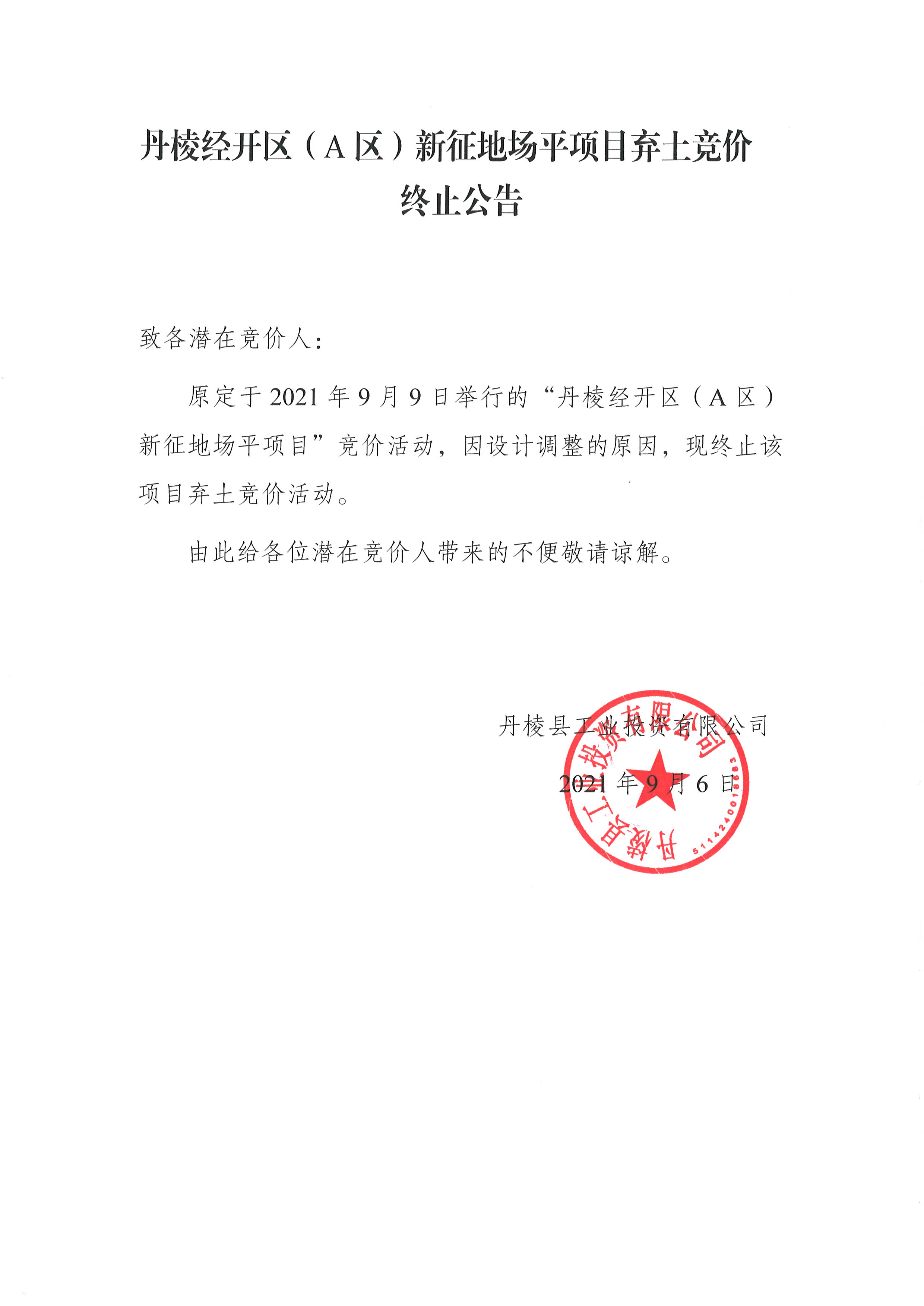 【县工投公司】丹棱经开区(A区)新征地场平项目弃土竞价终止公告
